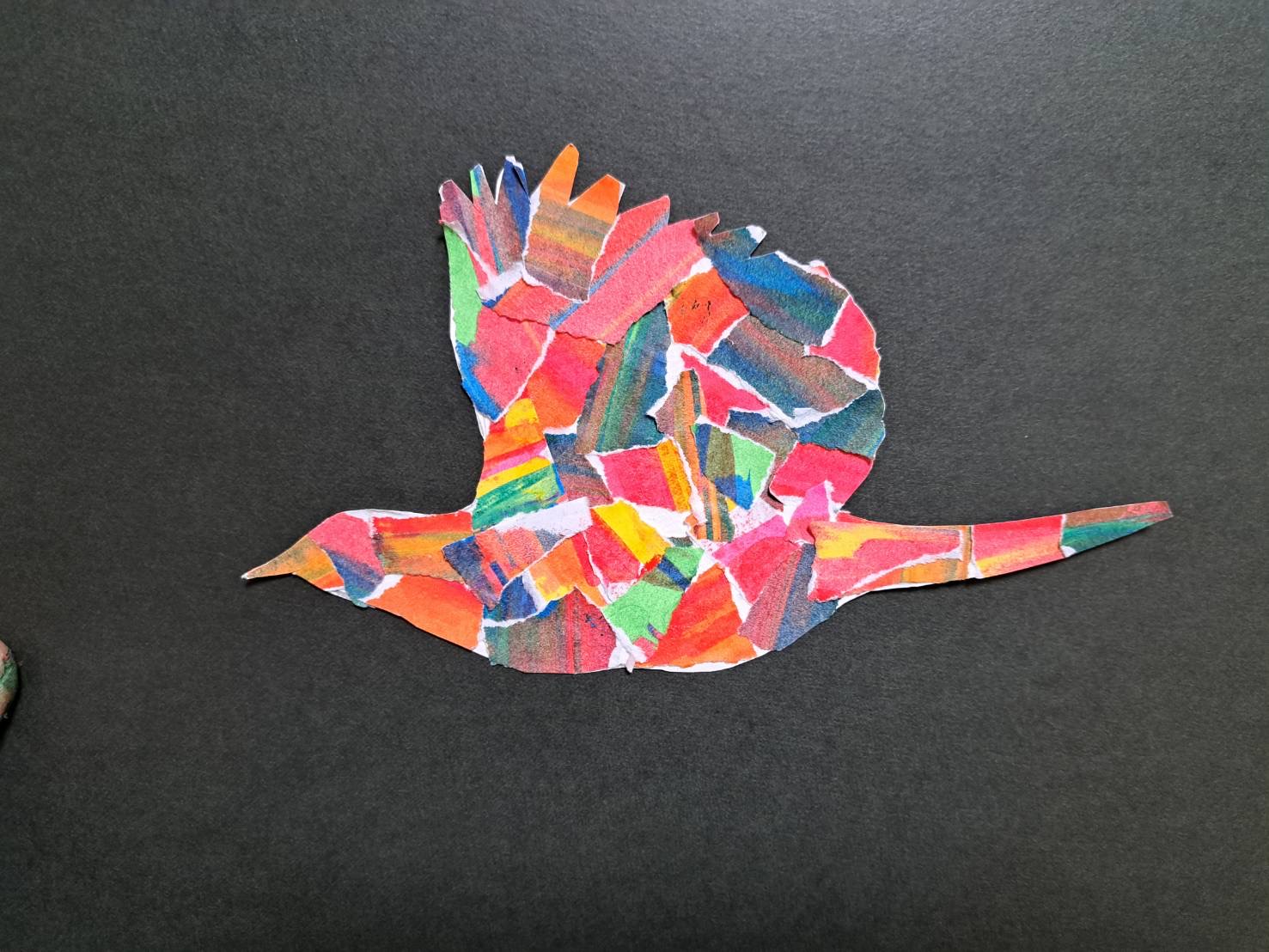 内容:未来の石橋文化センターを想像して、グループに分かれて、大きな蝶や鳥をつくるワークショップです。絵の具で色付けした紙を、切って貼りつけるコラージュ作品をつくります。