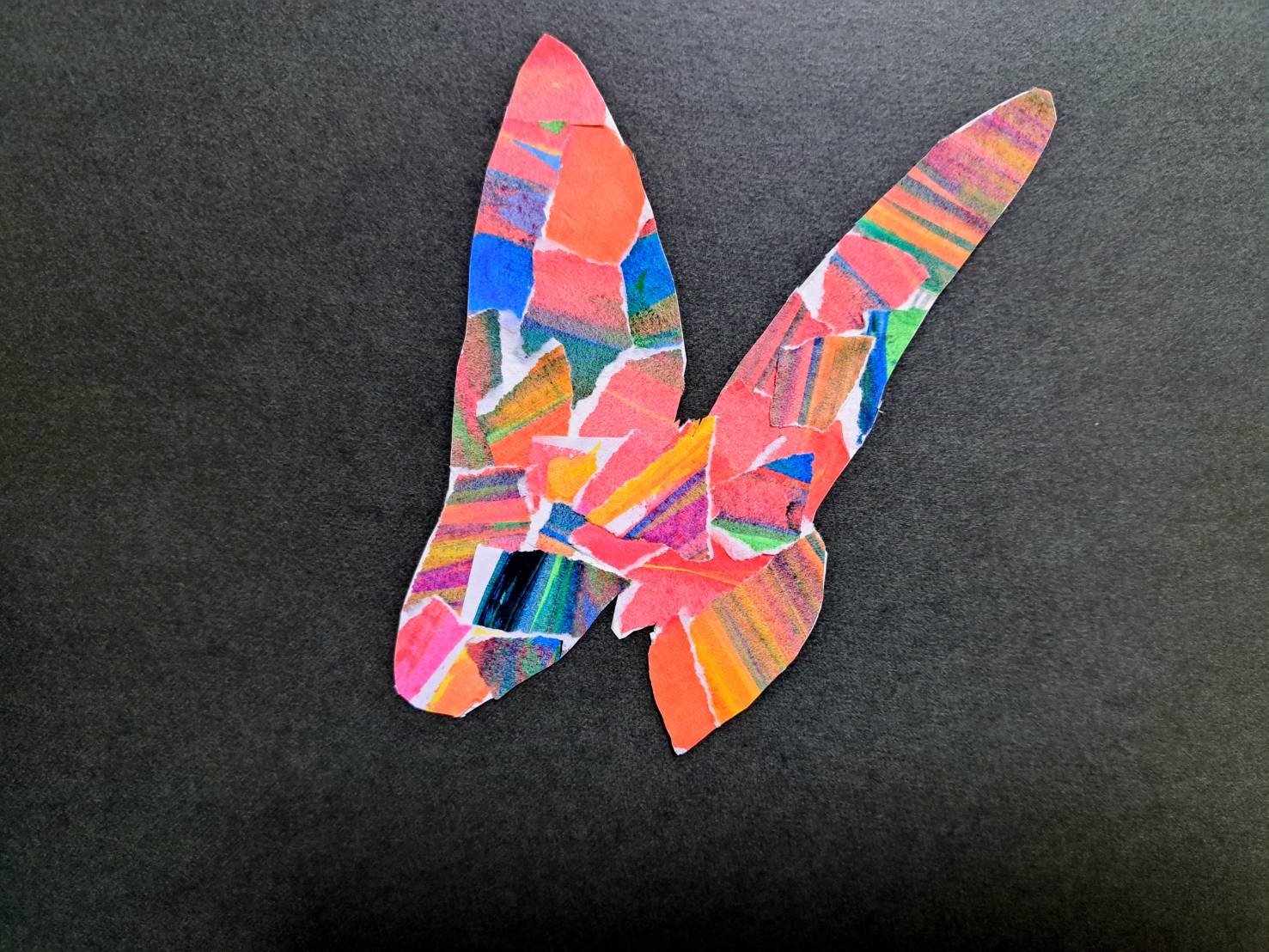 内容:未来の石橋文化センターを想像して、グループに分かれて、大きな蝶や鳥をつくるワークショップです。絵の具で色付けした紙を、切って貼りつけるコラージュ作品をつくります。