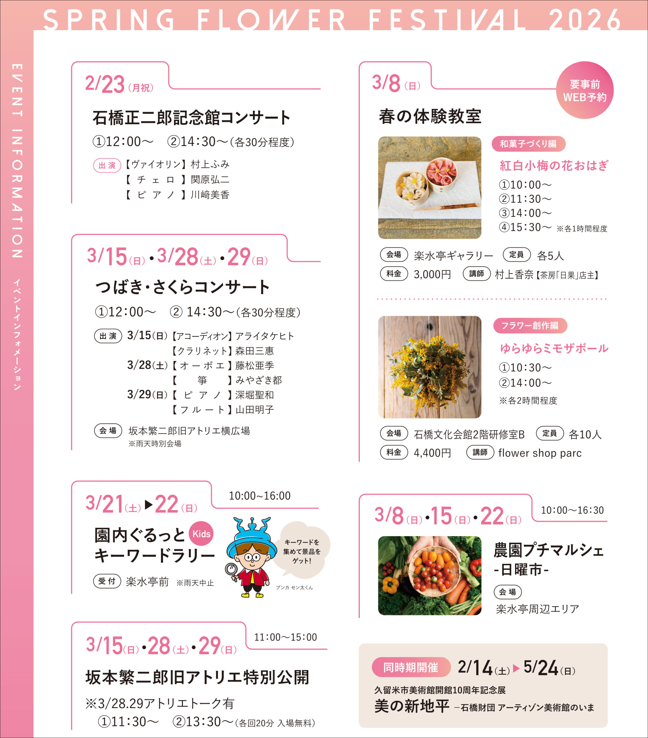 春の花まつり2026 梅まつり2.21(土)-3.8(日)/つばきまつり3.14(土)-22(日)/さくらまつり3.21(土)-31(火) 石橋文化センター園内全域 ※春の体験教室のWEB予約は2月10日(火)10:00から予約開始(本ページにて)