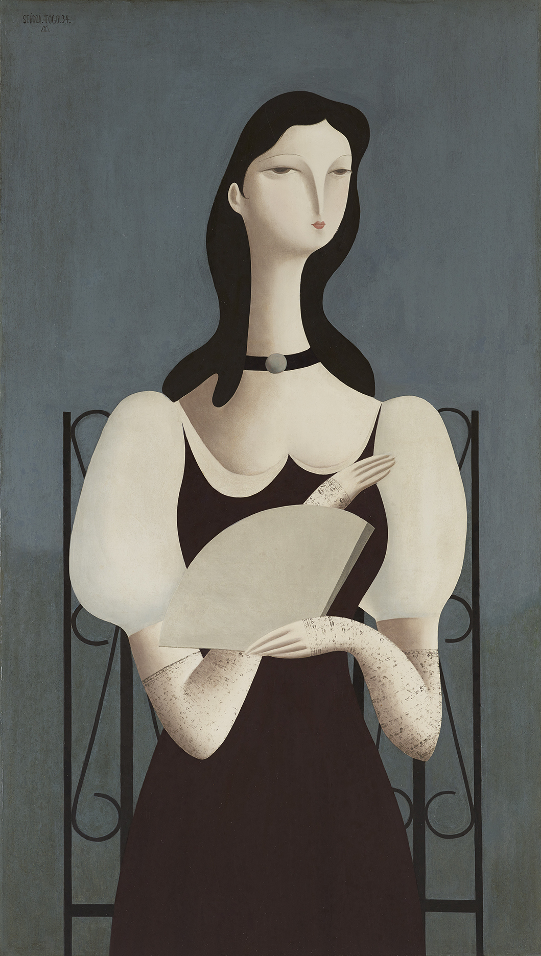 曲線をいかしたフェンスを背に、模様の入った手袋をはめて扇を持つ女性。1934年の第21回二科展絵葉書により、同展出品作の「扇」であることが判明した。本作を制作した1930年代は、東郷にとって前衛画家から大衆を意識した女性像の画家へ転身する時期にあたり、服や扇に見られる平面的な処理に前衛画家の名残がある一方、切れ長の目や細長い首や指先などに、後に「東郷様式」として確立する甘美な女性像の萌芽を見ることもできる。