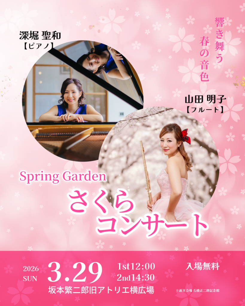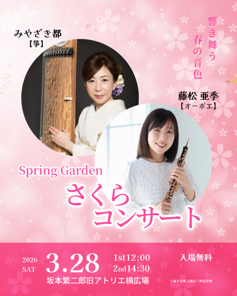 さくらコンサート開催!(3/28-29) 2026.03.27(金) 春の花々が見頃を迎える石橋文化センター。 桜に囲まれたステージで「さくらコンサート」を開催します。 響き舞う春の音色。この時期この場所だけの特別なひととき。 ぜひご来場ください。