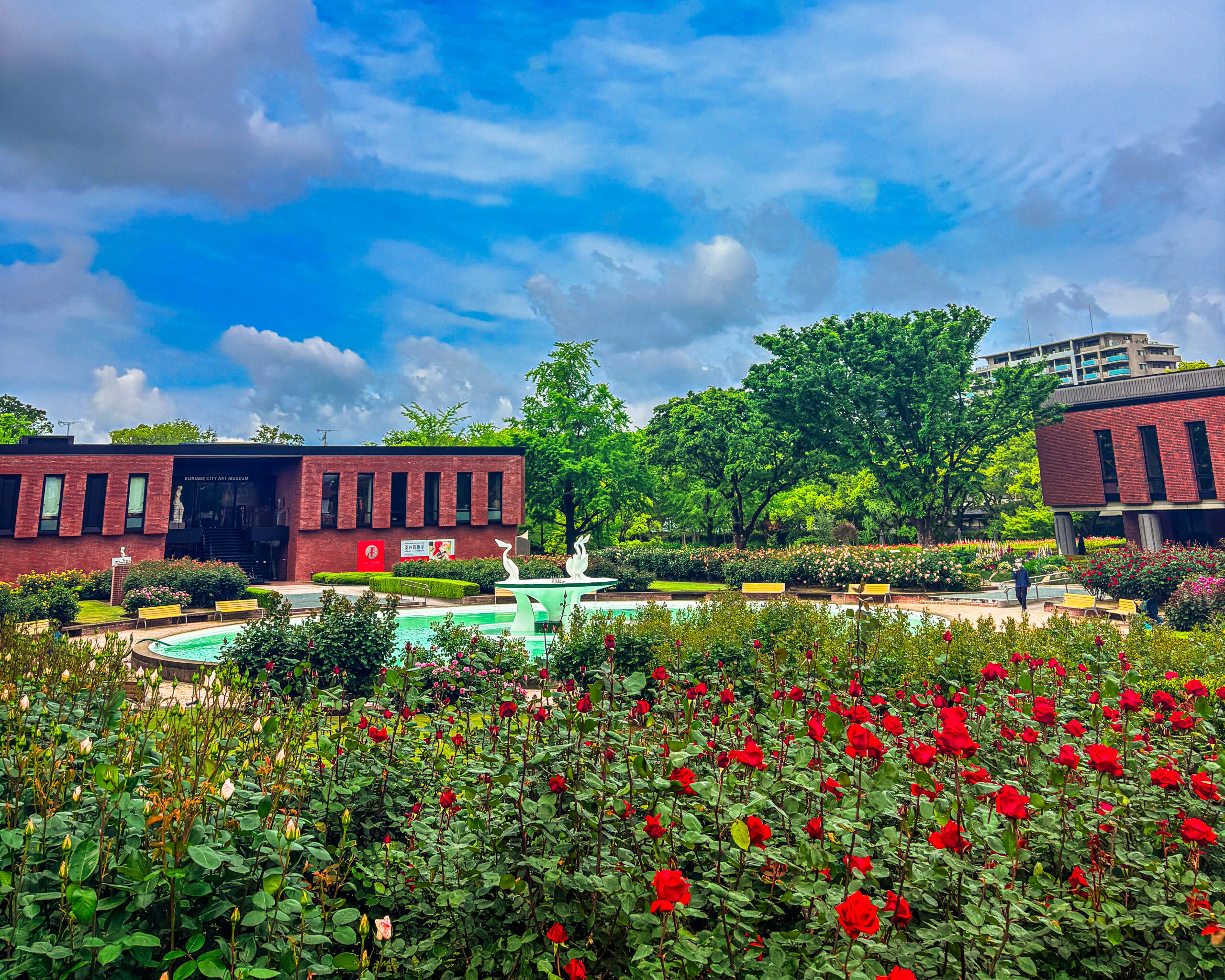 石橋文化センターは、1956(昭和31)年に株式会社ブリヂストンの創業者である石橋正二郎・名誉市民から郷土久留米市に寄贈されました。バラやツバキなど四季折々の花が彩る広大な庭園を有し、久留米市美術館をはじめ、音楽ホールや図書館を備える複合文化施設です。花と緑にあふれた園内は、市民の憩いの場として、芸術文化の拠点として、多くの人々に親しまれています。